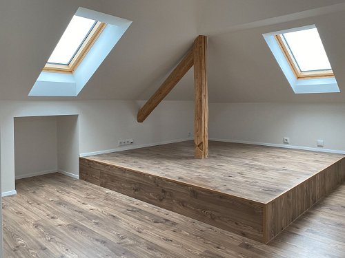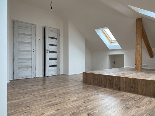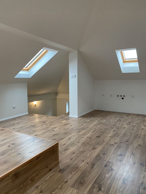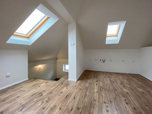 K prodeji moderní byt 2+kk umístěný v podkroví menšího třípatrového domu v klidné části Bystřice pod Hostýnem, na ulici Příční.